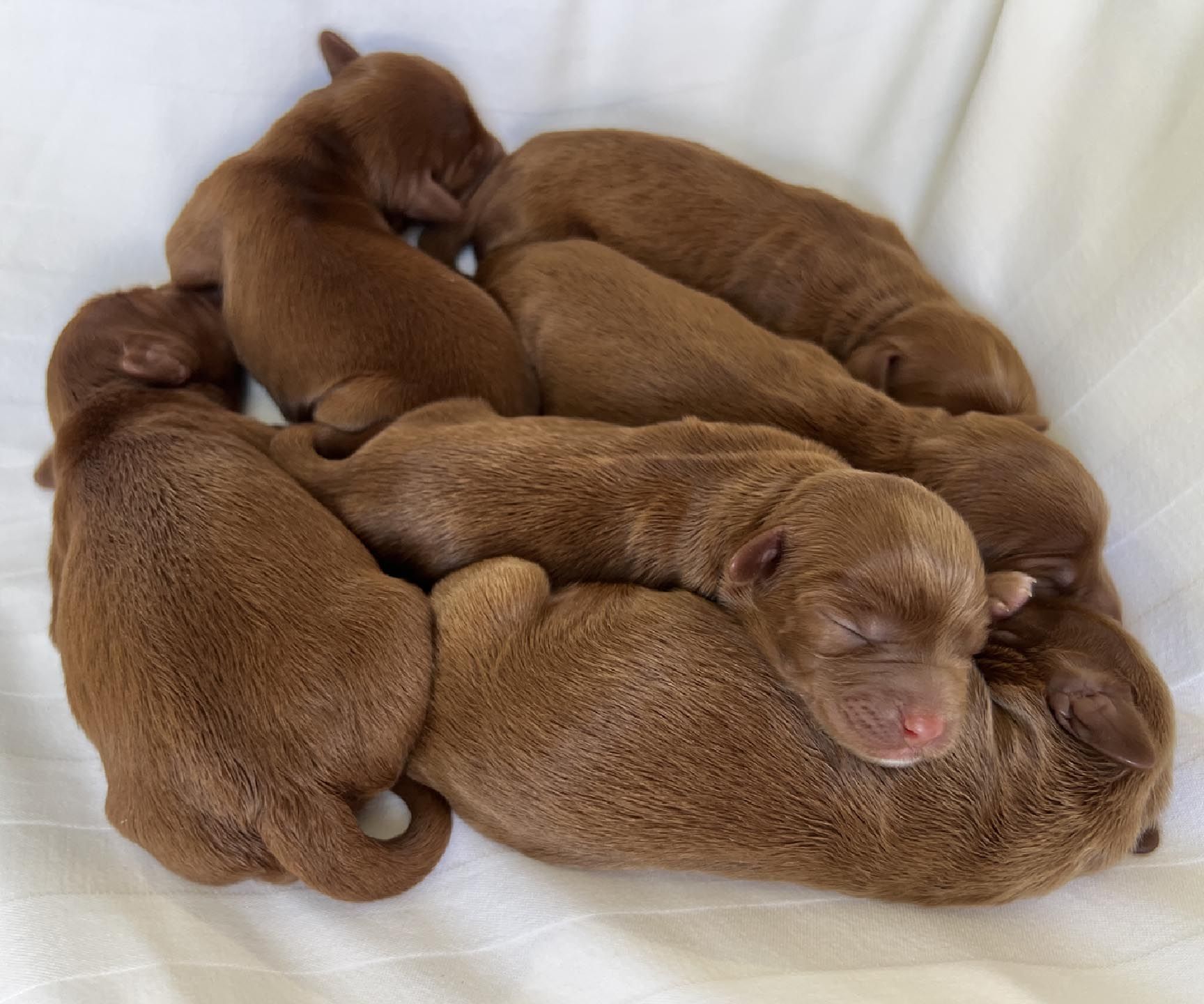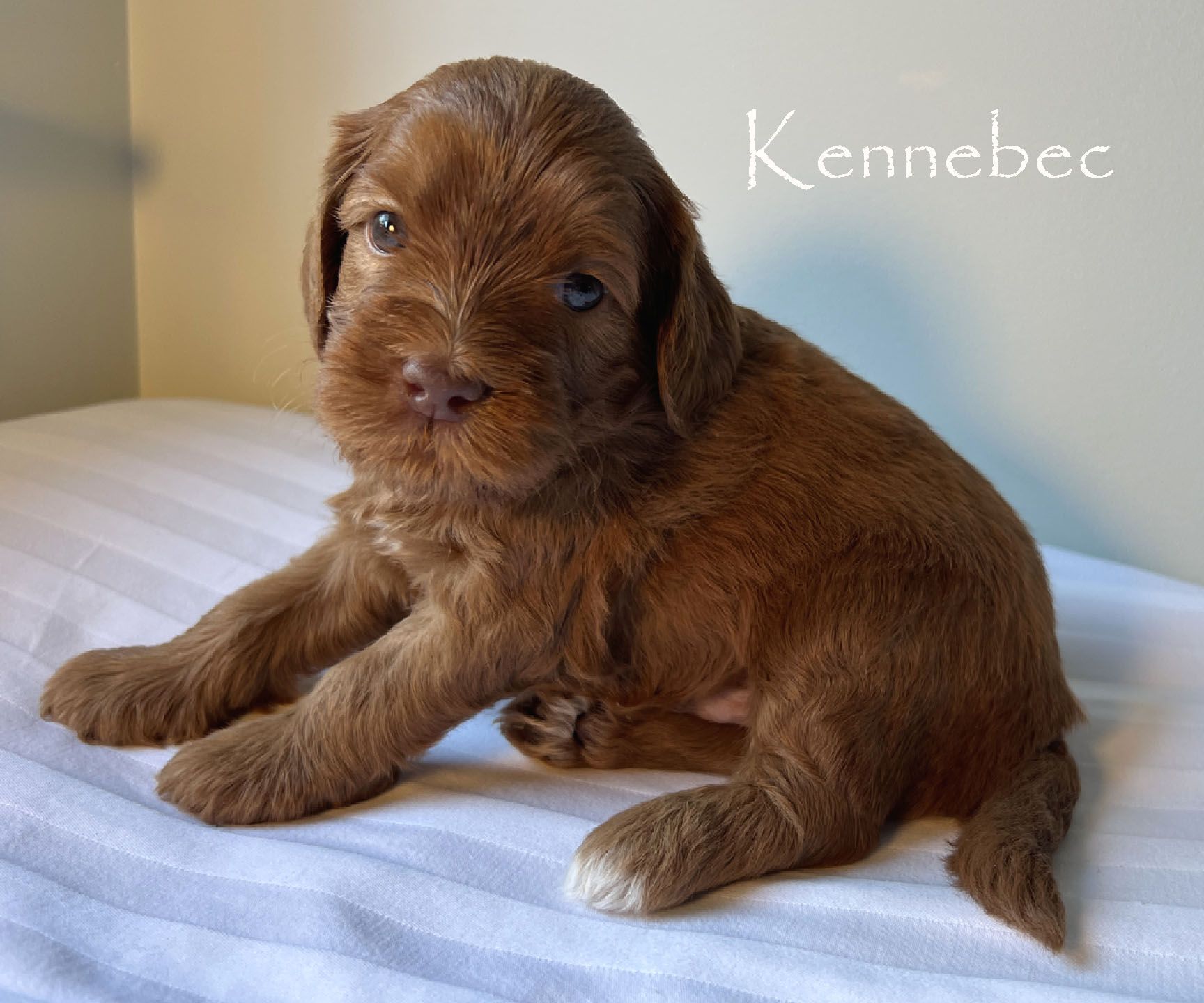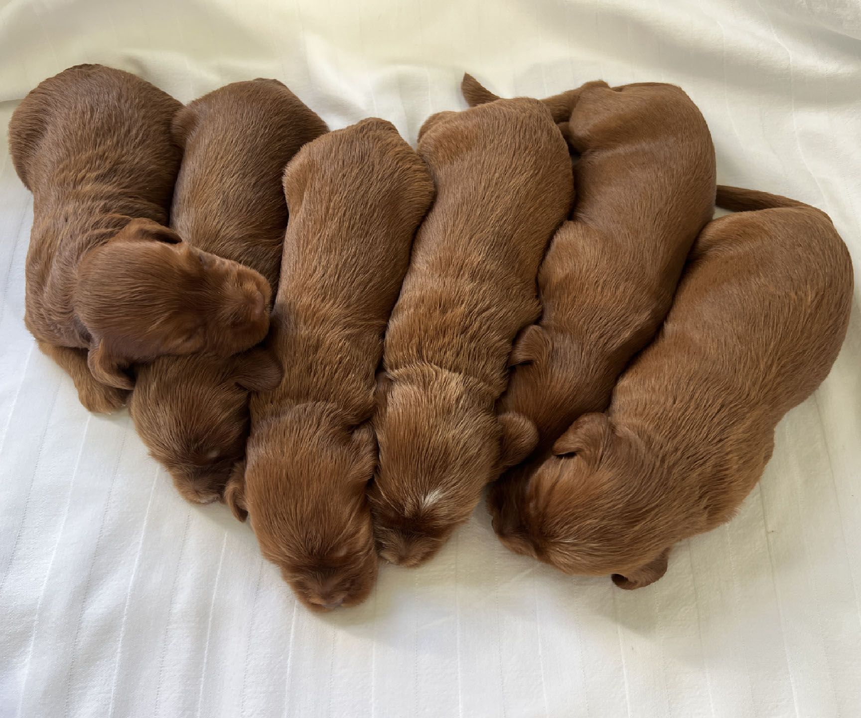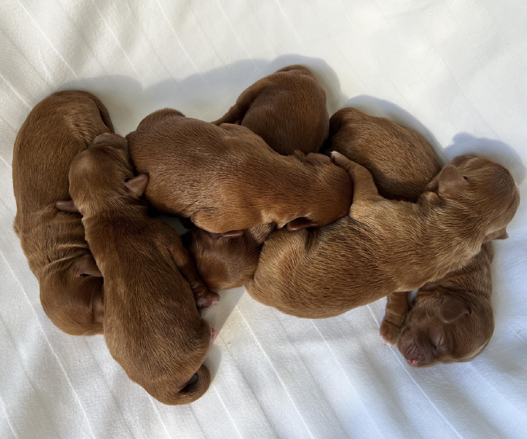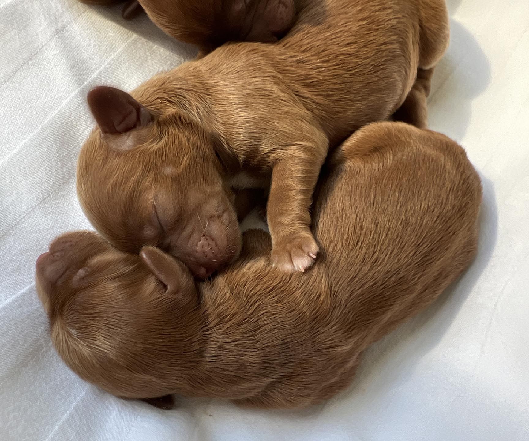 It's time to celebrate at Maine Light! Our stunning Maine Light Rolling River x Shaggy Moose Tracks puppies arrived on November 13th, 2025! In honor of the parents and our gorgeous Maine rivers, we give a hearty hello to our four sweet girls - Penobscot (Penny), Saco, Nonesuch, and Merriland (Merri) and our two handsome boys Kennebec and Allagash! We are over the moon! The puppies all have gorgeous silky soft fleece coats in vibrant shades of Caramel Red/Apricot. The pups will mature to large Miniature and small Medium size (20-35 pounds), just right for action and snuggling in laps! Both River and Moose have incredibly gentle, sweet, and intuitive temperaments, and their puppies will follow suit! Our beautiful puppies will be ready to join their forever families on January 8th, 2026. For more information about this and future litters, please contact us!