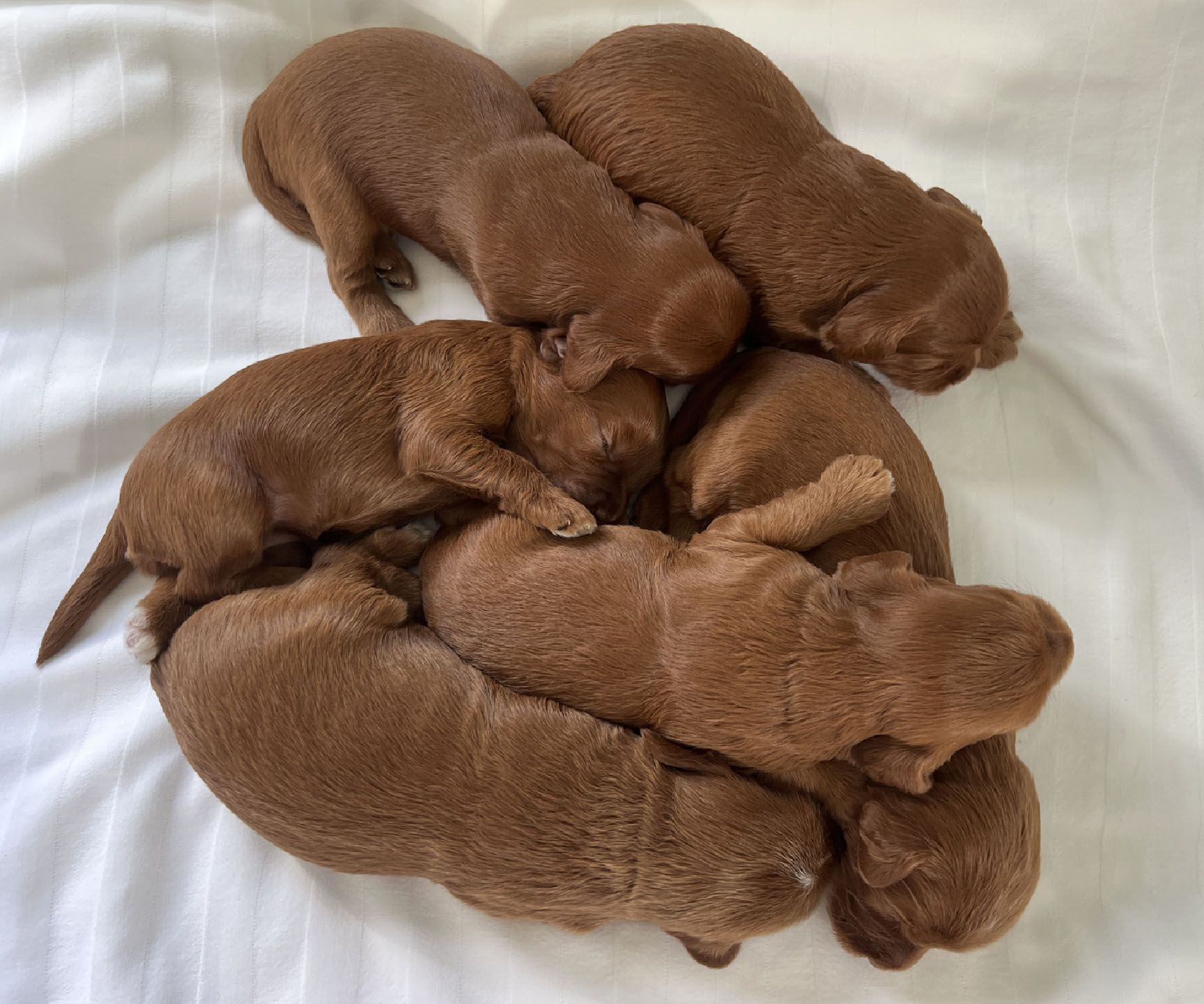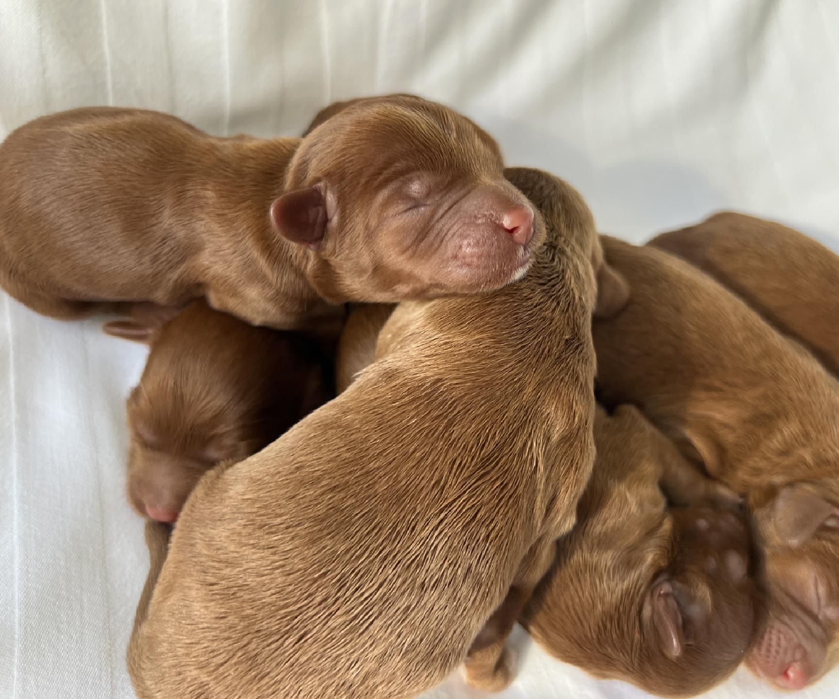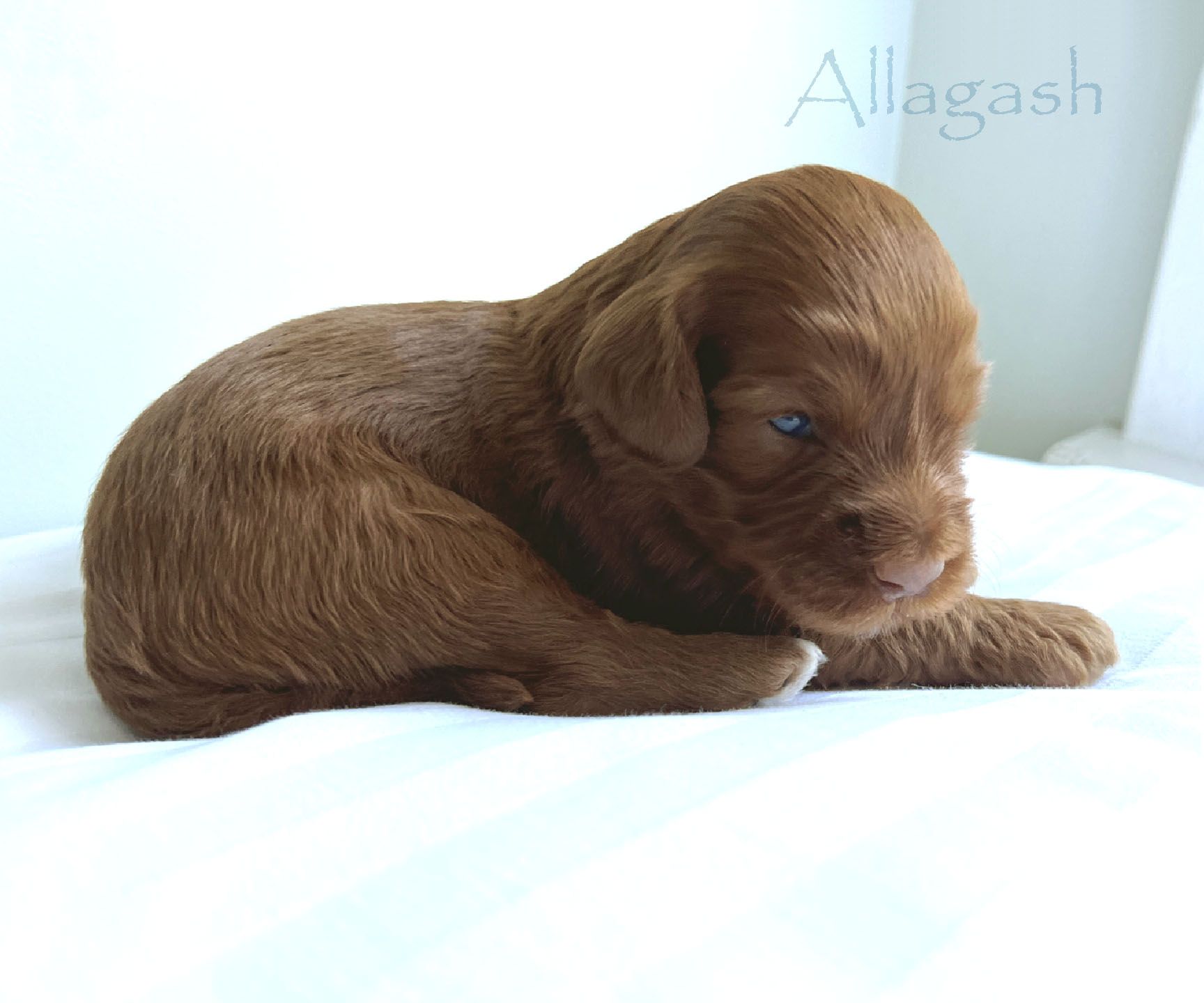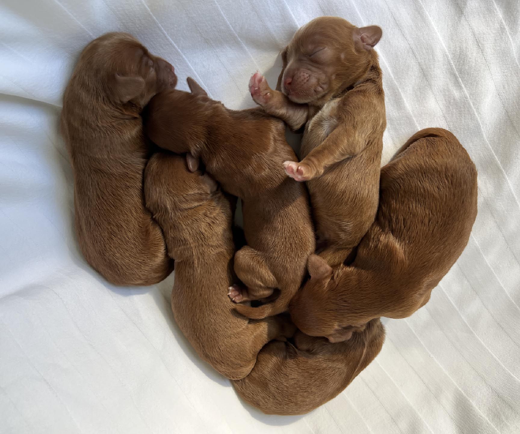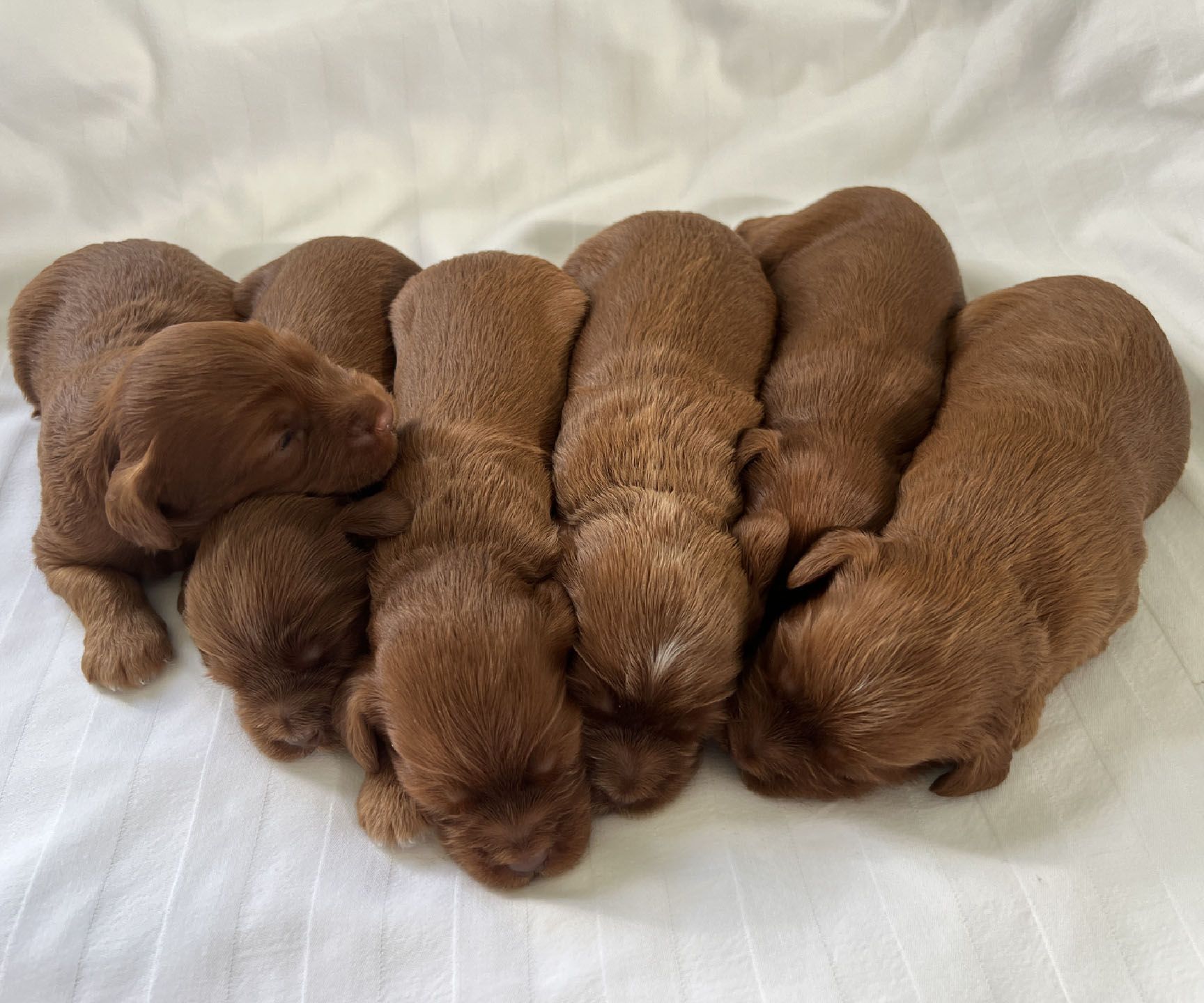 It's time to celebrate at Maine Light! Our stunning Maine Light Rolling River x Shaggy Moose Tracks puppies arrived on November 13th, 2025! In honor of the parents and our gorgeous Maine rivers, we give a hearty hello to our four sweet girls - Penobscot (Penny), Saco, Nonesuch, and Merriland (Merri) and our two handsome boys Kennebec and Allagash! We are over the moon! The puppies all have gorgeous silky soft fleece coats in vibrant shades of Caramel Red/Apricot. The pups will mature to large Miniature and small Medium size (20-35 pounds), just right for action and snuggling in laps! Both River and Moose have incredibly gentle, sweet, and intuitive temperaments, and their puppies will follow suit! Our beautiful puppies will be ready to join their forever families on January 8th, 2026. For more information about this and future litters, please contact us!